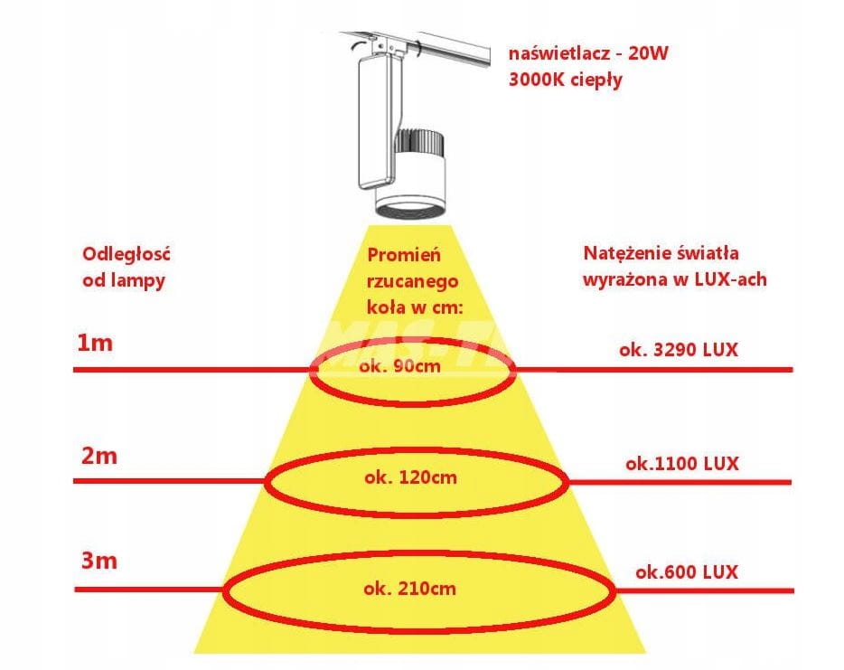 Reflektor Szynowy 1-fazowy LED COB o mocy 20W odpowiada tradycyjnej żarówce o mocy ok 160W.
