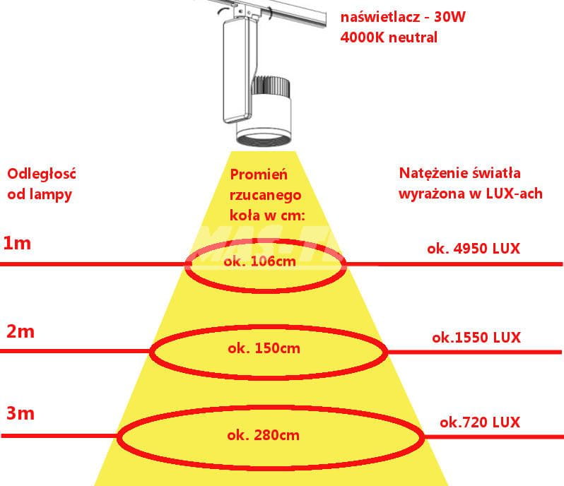 Reflektor Szynowy 1-fazowy LED COB o mocy 30W odpowiada tradycyjnej żarówce o mocy ok 210W.