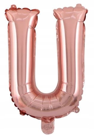 Balon foliowy litera U o wysokości ok 40cm (35-37cm po napompowaniu) w kolorze połyskującego ROSE GOLD. Balon posiada zawór, dzięki czemu powietrze nie uchodzi po napompowaniu. Literka posiadają "oczka" do montażu za pomocą żyłki / tasiemki tworząc w ten sposób balonową girlandę, można również przytwierdzić do ściany za pomocą kropek klejowych do balonów.