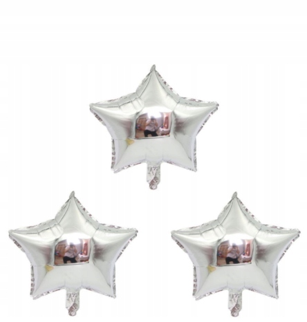 Balony foliowy gwiazda zestaw 3 sztuki o wymiarach ok 25 x 25cm w kolorze połyskującego srebra. Balon posiada zawór, dzięki czemu powietrze nie uchodzi po napompowaniu.