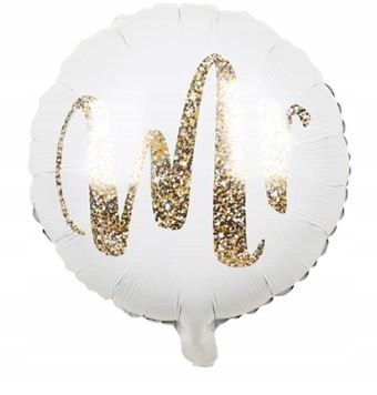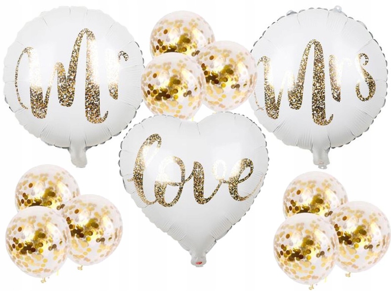 Balony foliowe serca ze złotymi napisami MRS, MR, LOVE o wysokości ok 45 cm plus balony ze złotym konfetti. Balony foliowe posiadają zawór, dzięki czemu powietrze nie uchodzi po napompowaniu.