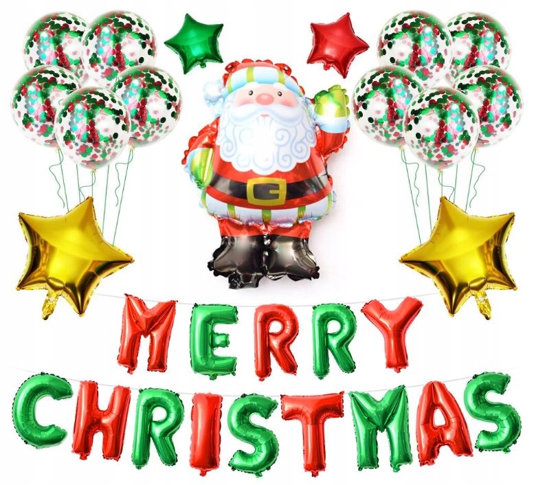 Zestaw 14 balonów LITEREK o wysokości ok 40cm układających się w świąteczny napis MERRY CHRISTMAS w kolorze połyskującym. Literki posiadają "oczka" do montażu za pomocą żyłki / tasiemki tworząc w ten sposób balonową girlandę, można również przytwierdzić do ściany za pomocą kropek klejowych do balonów. Girlanda idealna do dekoracji domu, sali, szkoły itp. Nie może jej zabraknąć na świętach domowych, firmowych i różnego rodzaju balach.