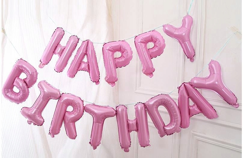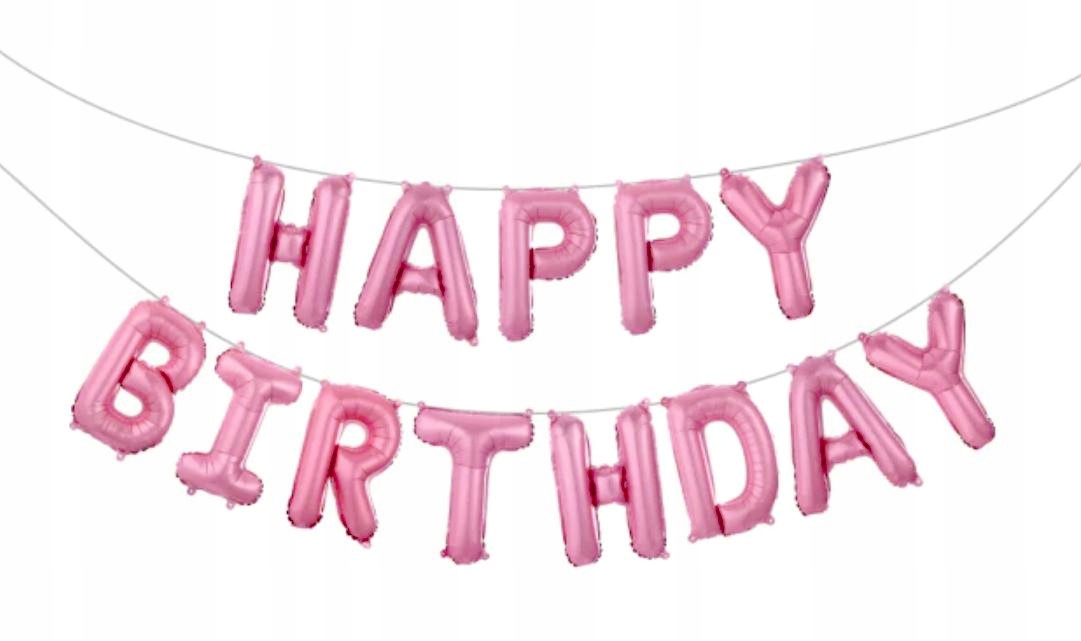 Zestaw 13 balonów LITEREK o wysokości ok 35cm układających się w urodzinowy napis HAPPY BIRTHDAY w kolorze połyskującego różu. Literki posiadają "oczka" do montażu za pomocą żyłki / tasiemki tworząc w ten sposób balonową girlandę, można również przytwierdzić do ściany za pomocą kropek klejowych do balonów.