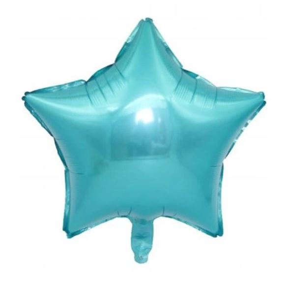 Zestaw balonów foliowych gwiazdy o wysokości ok 45 cm w kolorze połyskującego błękitnego. Balon posiada zawór, dzięki czemu powietrze nie uchodzi po napompowaniu.