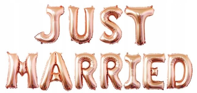 Zestaw 11 balonów LITEREK o wysokości ok 40cm układających się w napis JUST MARRIED w kolorze połyskującego różowego złota. Literki posiadają "oczka" do montażu za pomocą żyłki / tasiemki tworząc w ten sposób balonową girlandę, można również przytwierdzić do ściany za pomocą kropek klejowych do balonów.
