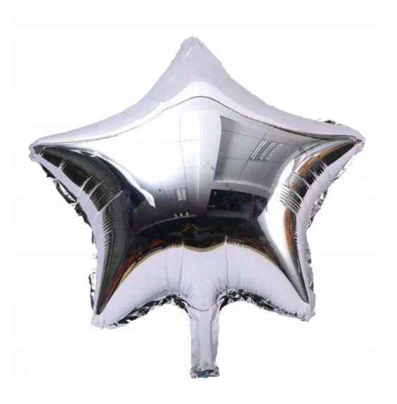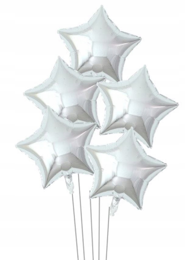 Zestaw balonów foliowych gwiazdy o wysokości ok 45 cm w kolorze połyskującego srebra. Balon posiada zawór, dzięki czemu powietrze nie uchodzi po napompowaniu.