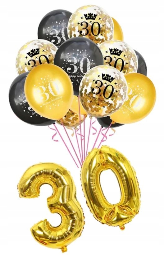 BALONY na 30 URODZINY trzydziestka złote czarne