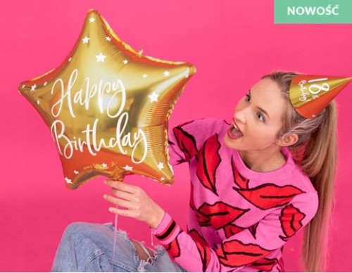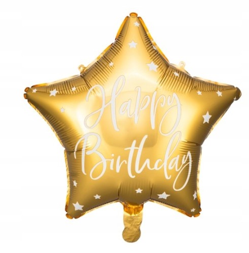 Balon foliowy złoty gwiazda z nadrukiem Happy Birthday o wielkości 40 cm .