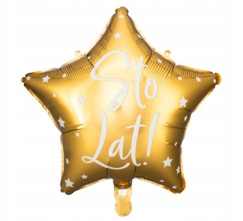 Balon foliowy złoty gwiazda z nadrukiem Sto Lat! o wielkości 40 cm . Balon posiada zawór, dzięki czemu powietrze nie uchodzi po napompowaniu. Nieodłączny element każdego urodzinowego przyjęcia.
