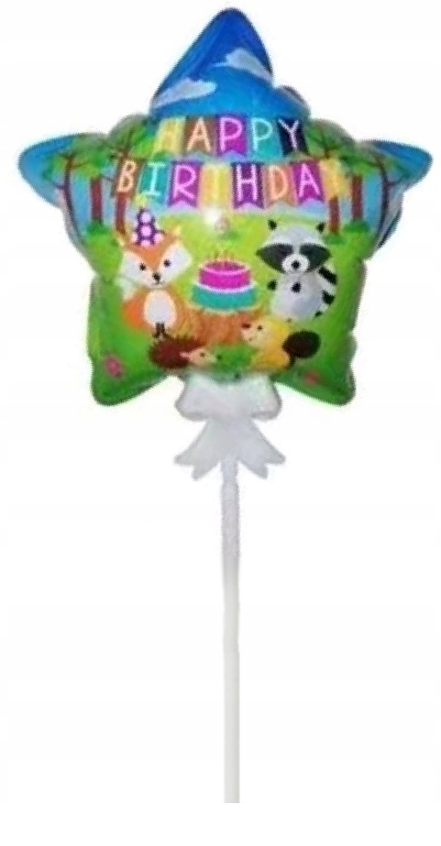Balon gwiazdka samopompujący zwierzęta leśne na patyku z konfetti w środku