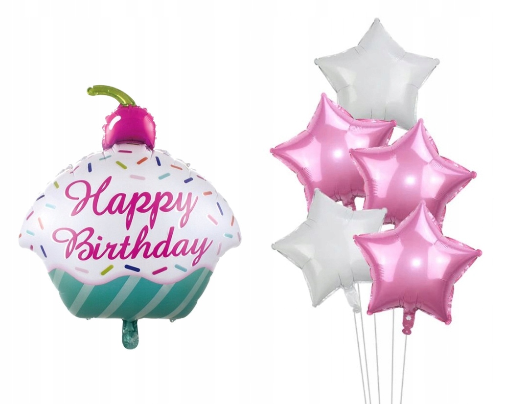 Balony urodzinowe różowe białe gwiazdy babeczka