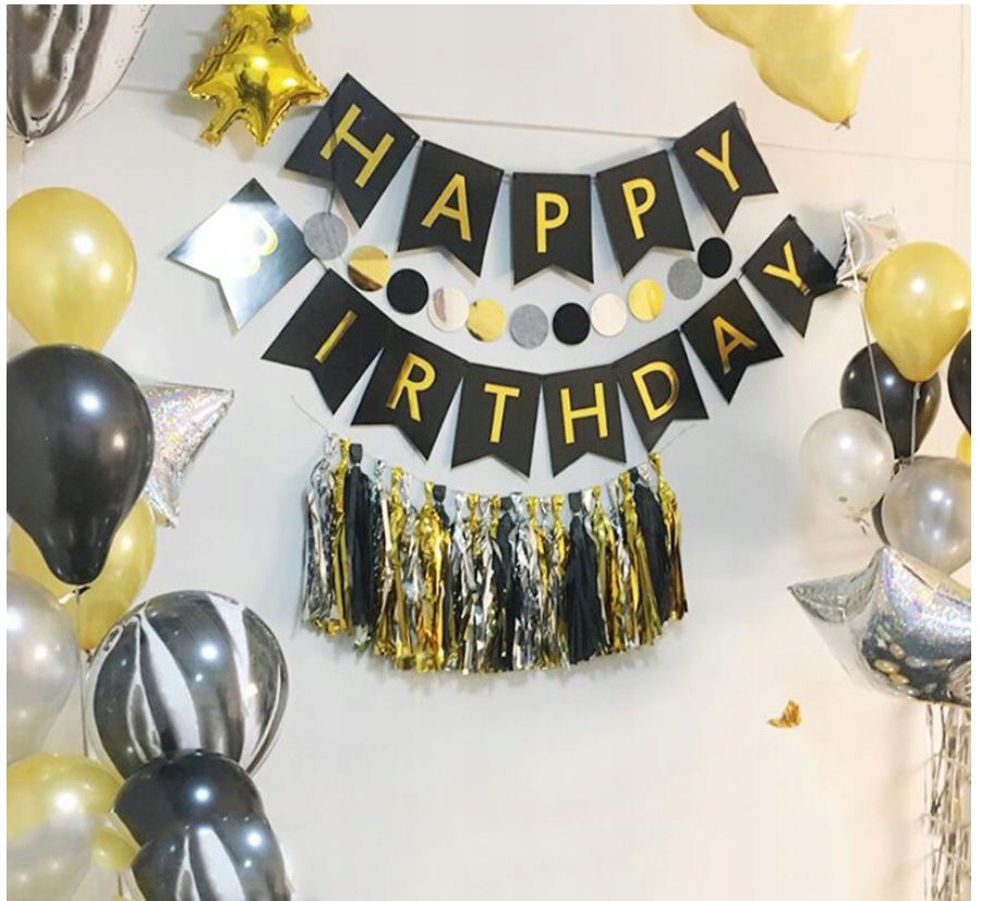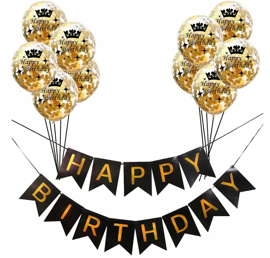 Zestaw dużych lateksowych balonów ze złotym konfetti i nadrukiem HAPPY BIRTHDAY + czarny baner HAPPY BIRTHDAY.