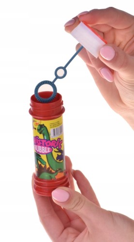 Pojemniczek z tworzywa sztucznego napełniony jest mydlanym płynem wystarczy dmuchać aby powstały piękne, kolorowe bańki!