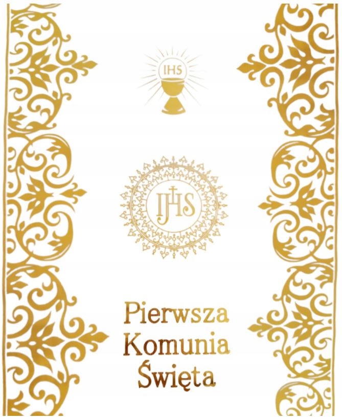 Biały elegancki bieżnik dekorowany złotymi symbolami komunijnymi oraz napisem. Bieżnik doskonale sprawdzi się w dekoracjach komunijnego stołu, podkreśli uroczysty charakter przyjęcia. Bieżnik można przyciąć w dowolnym miejscu.