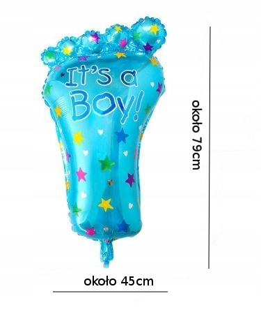 DUŻY Balon foliowy stopa o wysokości ok 79cm w kolorze połyskującego błekitu z napisem It's a Boy !. Balon posiada zawór, dzięki czemu powietrze nie uchodzi po napompowaniu.