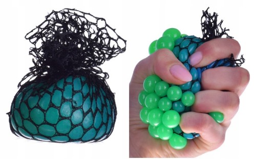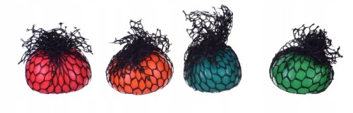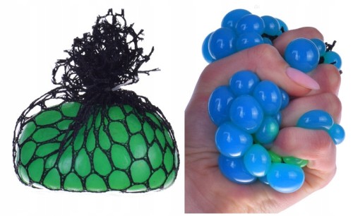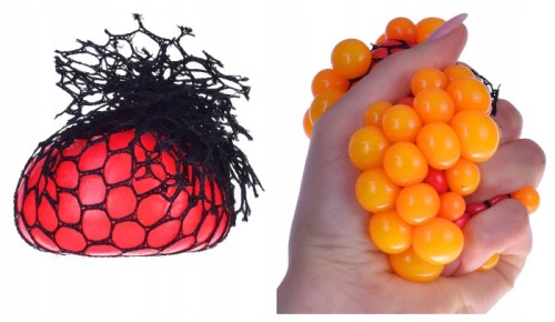 - ATRAKCYJNY WYGLĄD – piłka jest wykonana w 4 soczystych i przyjemnych dla oka kolorach: zielony, czerwony, pomarańczowy i niebieski; umieszczona jest w czarnej siatce z niewielkimi oczkami, co sprawia, że w momencie ściskania piłka przybiera kształt kiści winogrona, co daje niezwykle ciekawy efekt wizualny; po puszczeniu piłka wraca do swojego pierwotnego kształtu.