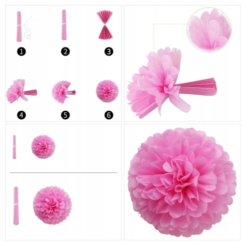 Pompony wykonane z bibuły to świetna, wisząca dekoracja w kształcie kwiata, mocowana na tasiemkę. Idealnie nadają się do dekoracji sal weselnych i imprez okolicznościowych. Pompon ma średnicę 15 cm.