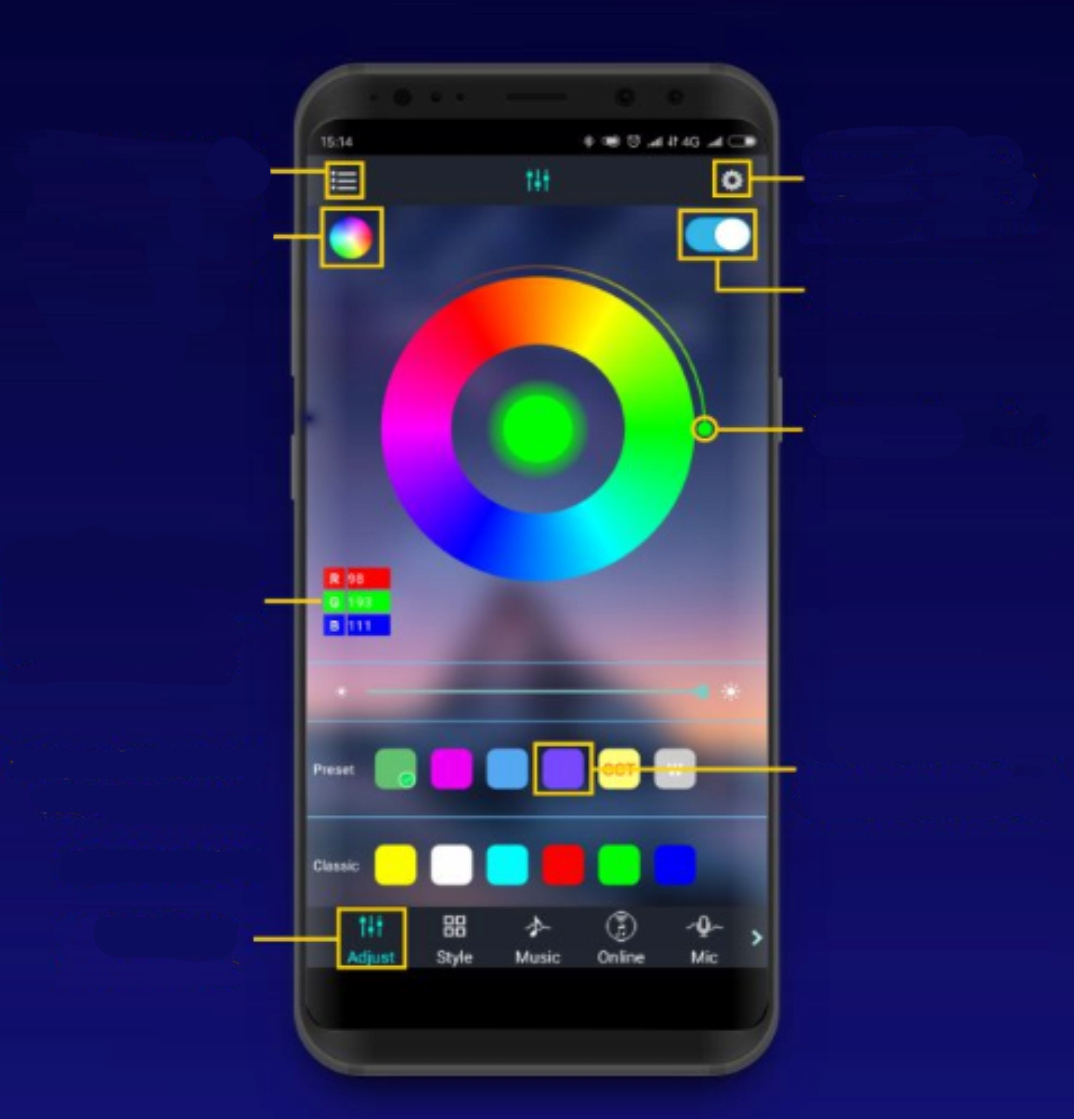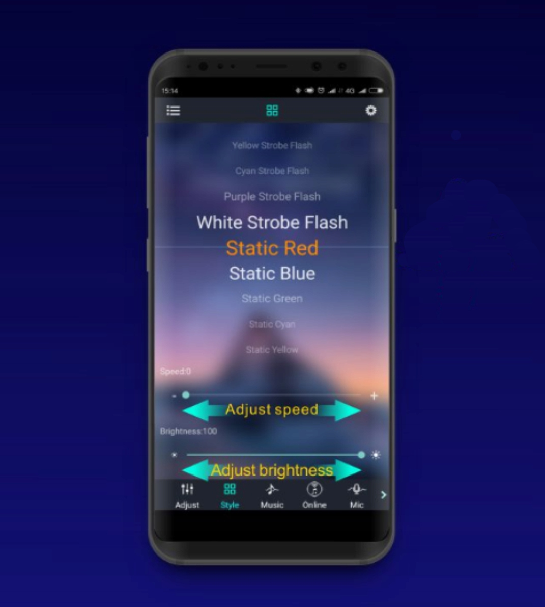 - świecenie w rytm muzyki odtwarzanej w smartfonie