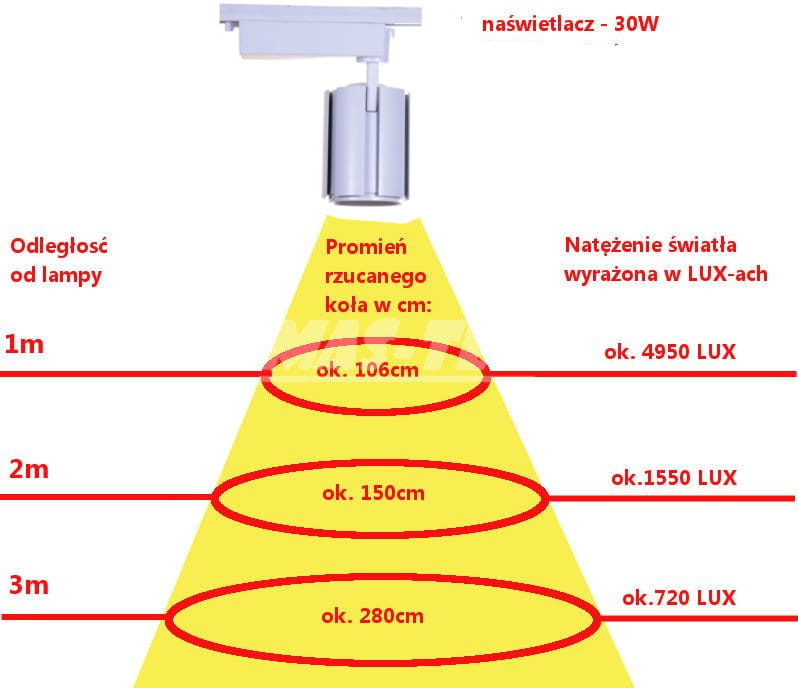 Reflektor Szynowy 1-fazowy LED COB o mocy 30W odpowiada tradycyjnej żarówce o mocy ok 210W.