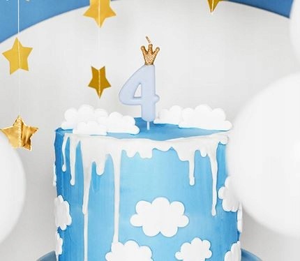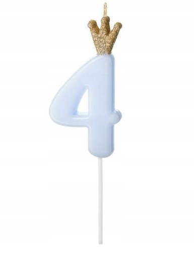 Urocza świeczka w kolorze niebieskim w kształcie cyfry 4 ze złotą koroną, to idealny dodatek dekoracyjny na tort z okazji przyjęcia urodzinowego, dekoracja tortu z pewnością wywoła uśmiech na twarzy Twojej pociechy.