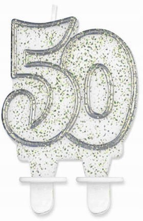 Świeczka urodzinowa 50 brokatowe srebrne na tort