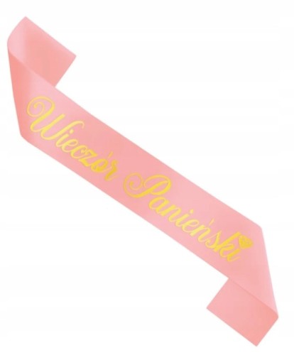 Szarfa różowa z napisem WIECZÓR PANIEŃSKI w kolorze złotym.