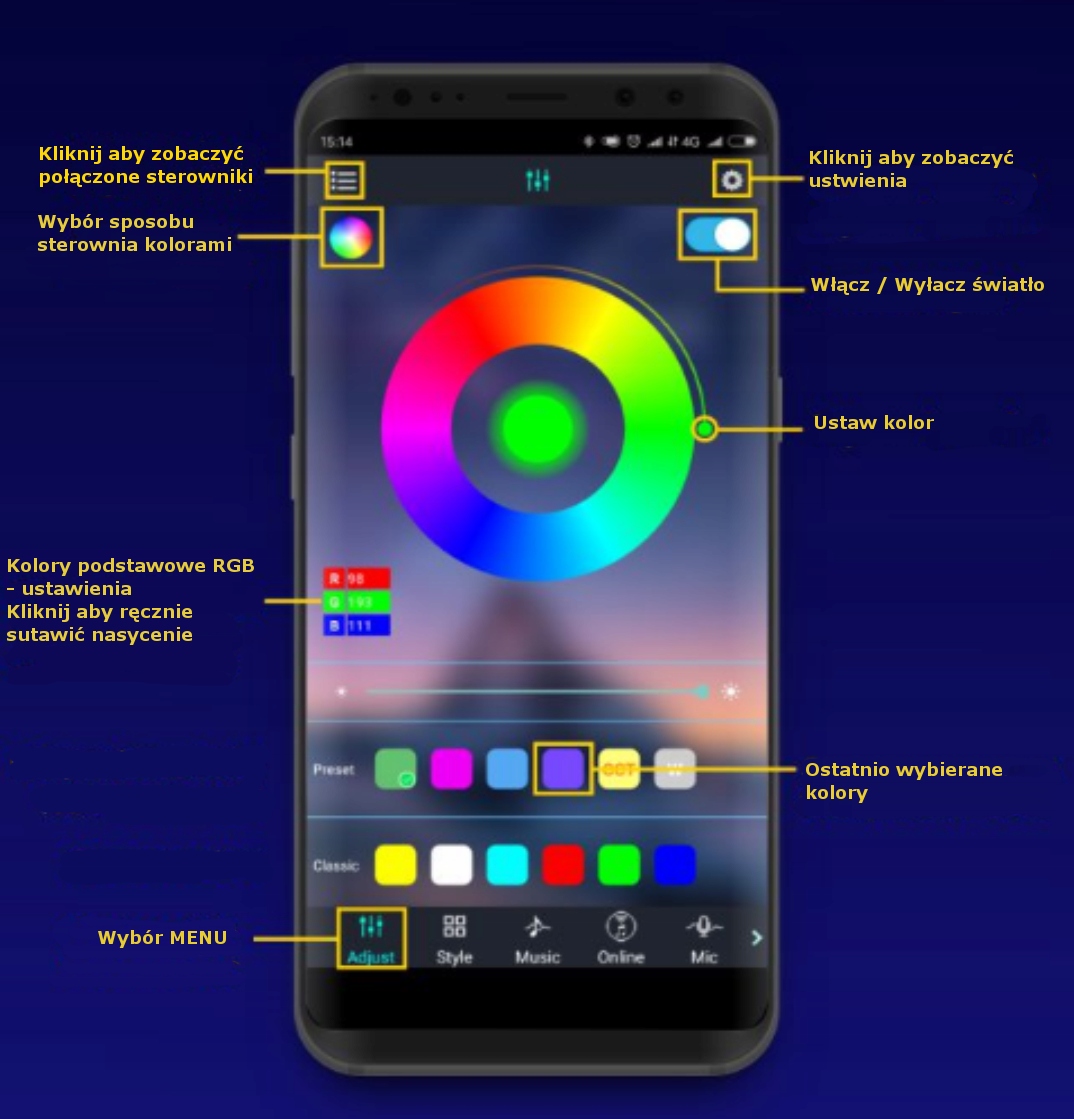 - świecenie w rytm muzyki odtwarzanej w smartfonie