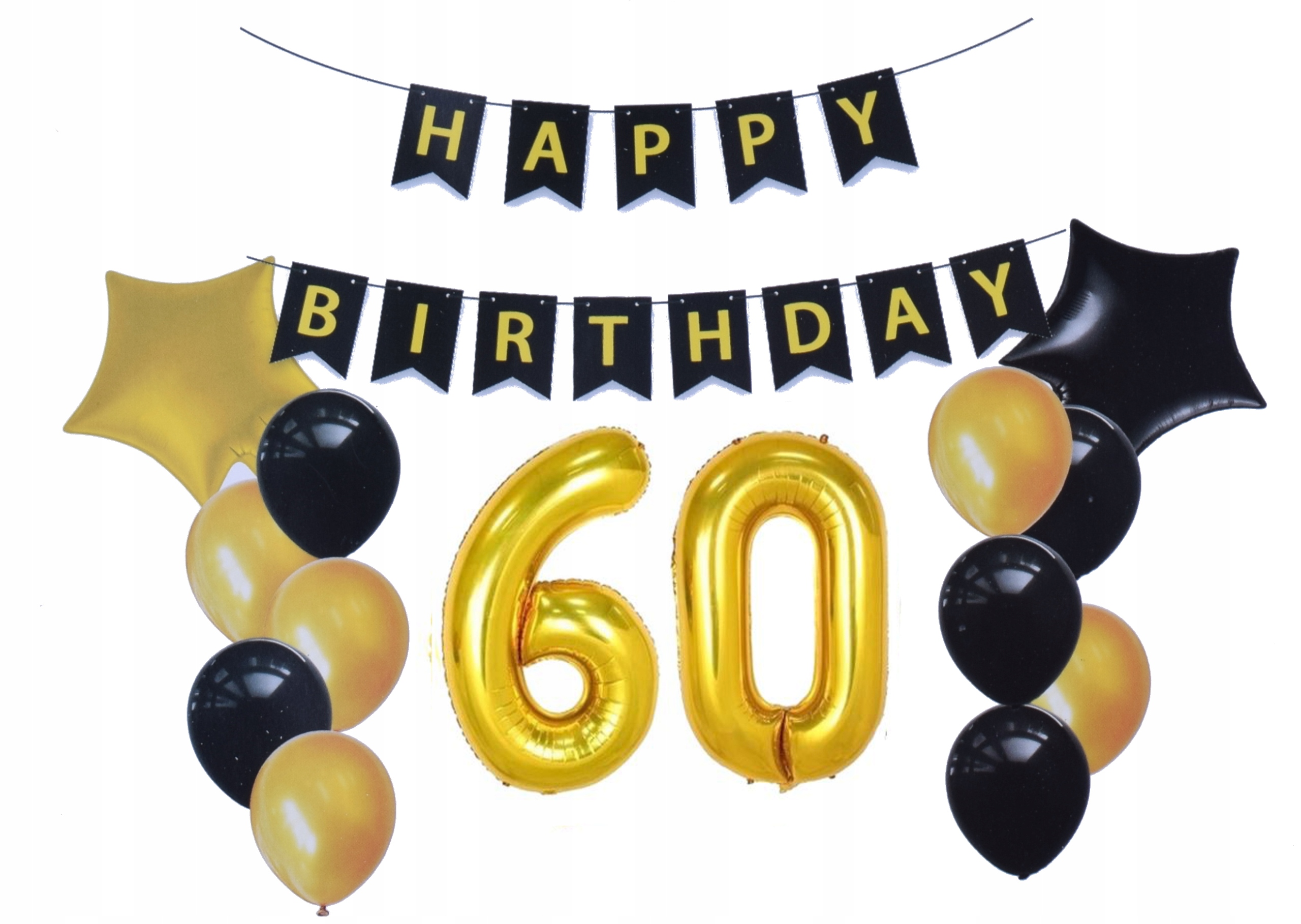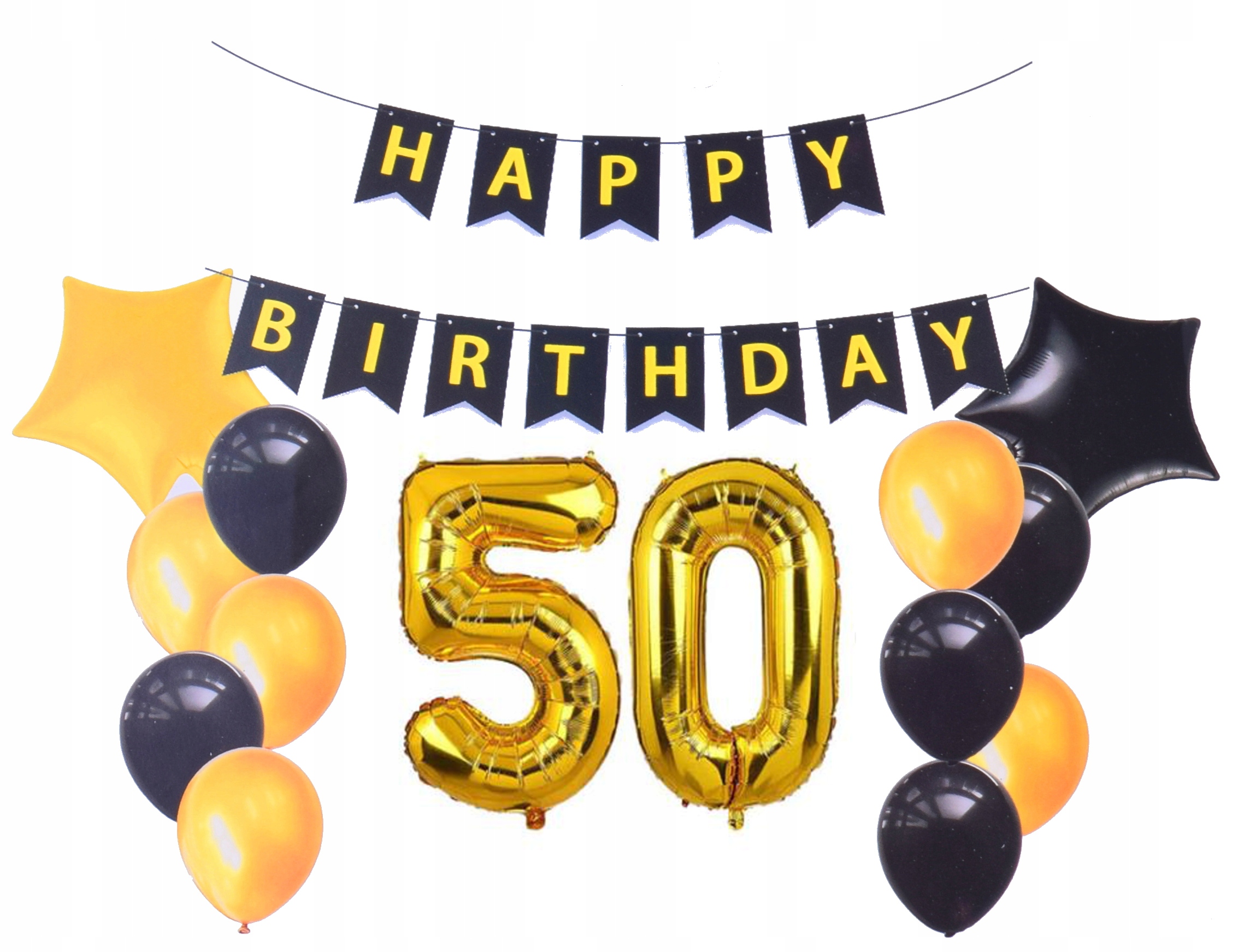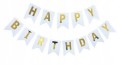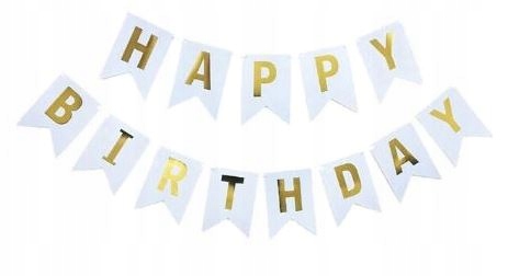- napis Baner urodzinowy w kolorze czrnym z złotym napisem Happy Birthday 13 karteczek na wstążce