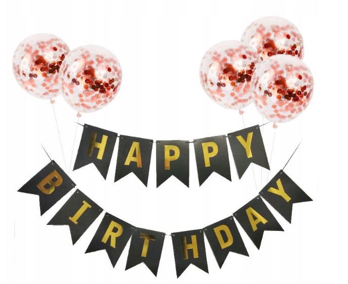 - napis Baner urodzinowy w kolorze czrnym z złotym napisem Happy Birthday 13 karteczek na wstążce