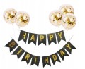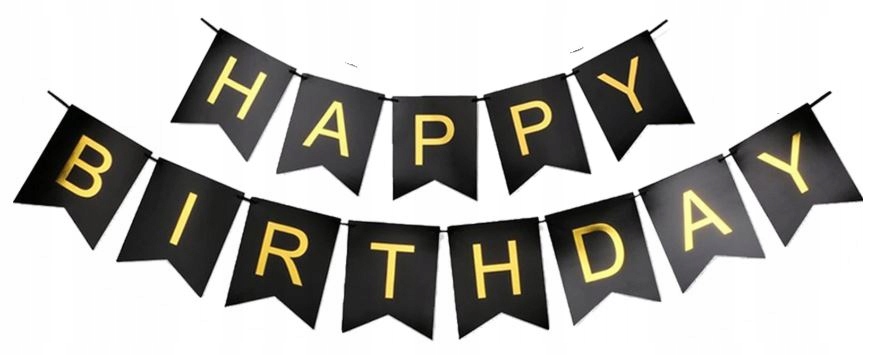 - napis Baner urodzinowy w kolorze czrnym z złotym napisem Happy Birthday 13 karteczek na wstążce