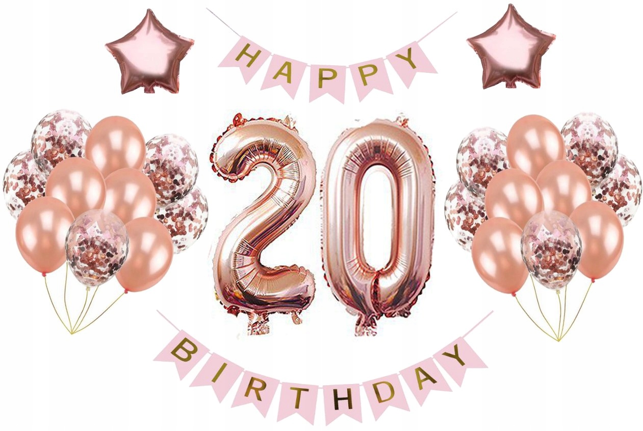 Zestaw balonów dekoracyjnych na 20 urodziny. Rewelacyjnie sprawdzi się również jako element dekoracji.