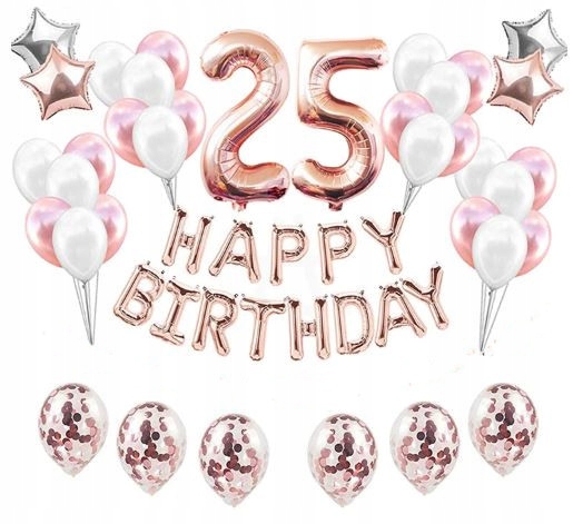 Zestaw balonów dekoracyjnych na 25 urodziny. Rewelacyjnie sprawdzi się również jako element dekoracji.