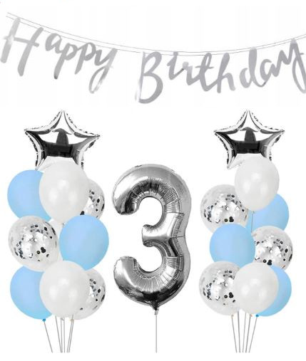 Zestaw balonów dekoracyjnych na 3 urodziny. Rewelacyjnie sprawdzi się jako element dekoracji.