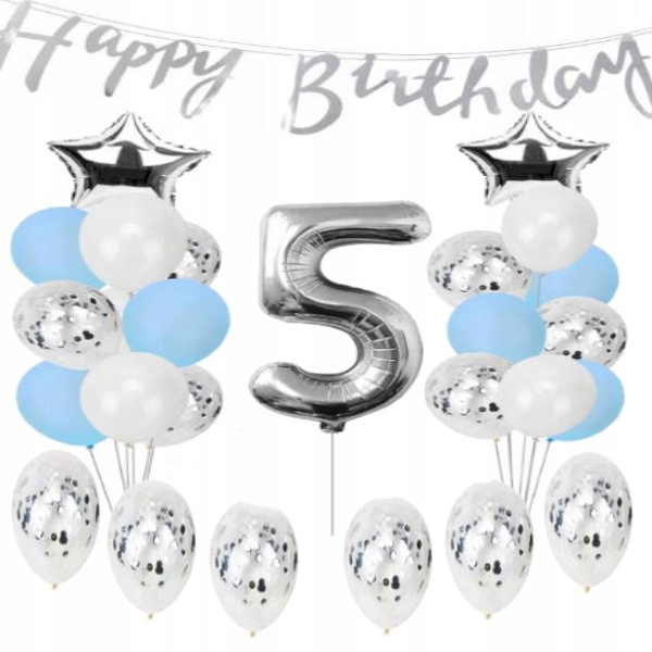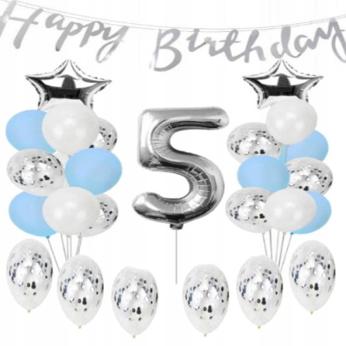 ZESTAW BALONY URODZINY 5 piąte srebrne 38szt dekor