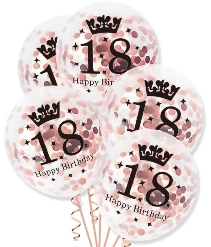 - balony przezroczyste z nadrukiem 18 i z Konfetti w Kolorze Rose Gold w środku - Wielkość około 30 cm - 6 sztuk