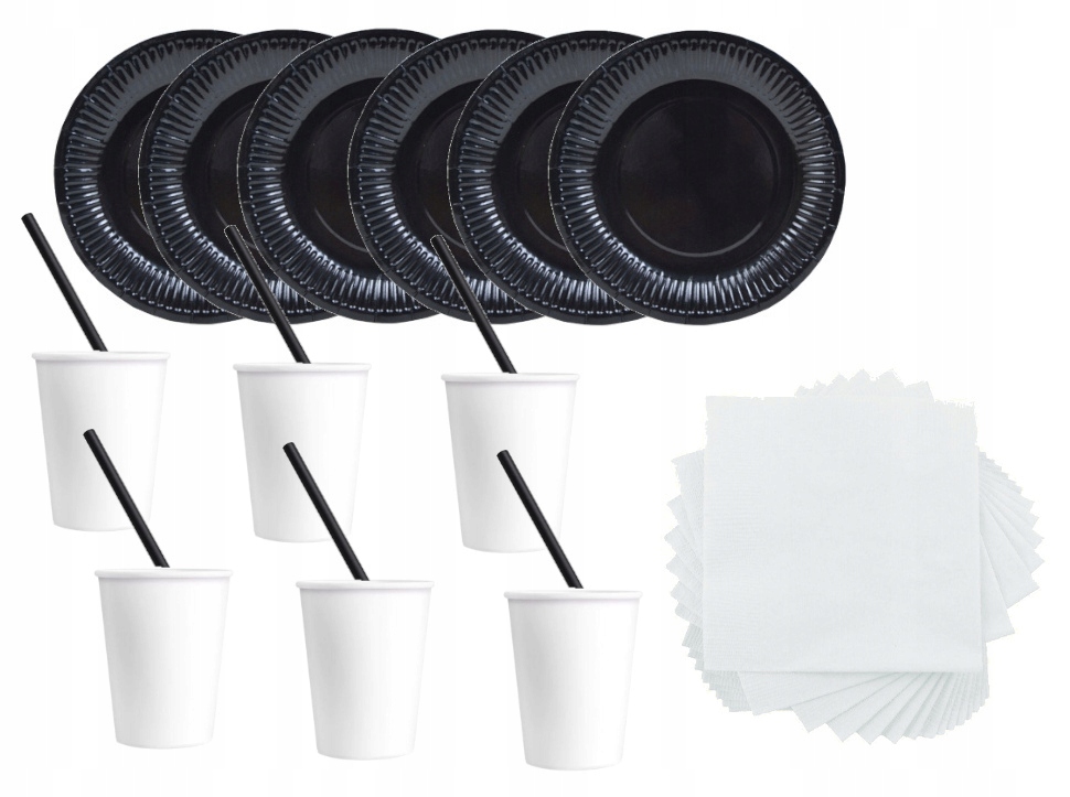 ZESTAW serwetki kubki białe talerze słomki czarne