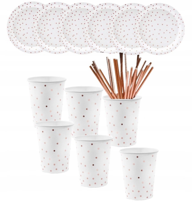 Zestaw papierowy w kolorze białym w kropeczki w kolorze różowego złota.