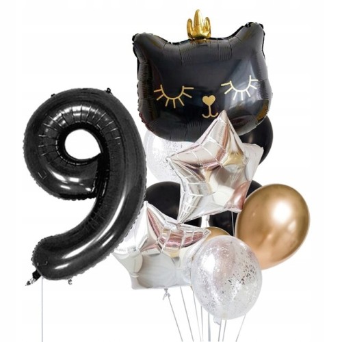 Zestaw balonów 9 dziewiąte urodziny kotek czarny