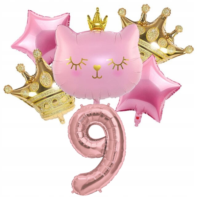Zestaw balonów 9 dziewiąte urodziny kotek różowy