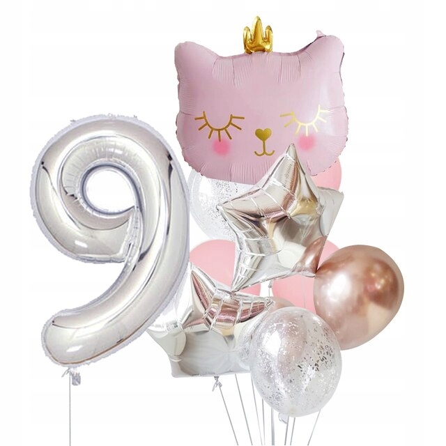 Zestaw balonów 9 dziewiąte urodziny kotek różowy