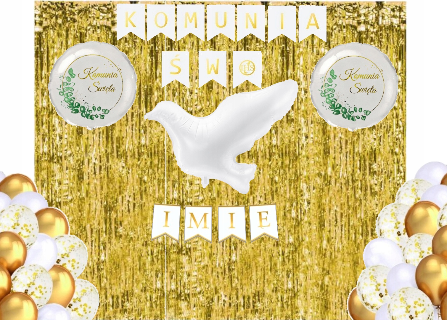 Zestaw balonów KOMUNIA złoty biały baner + imię