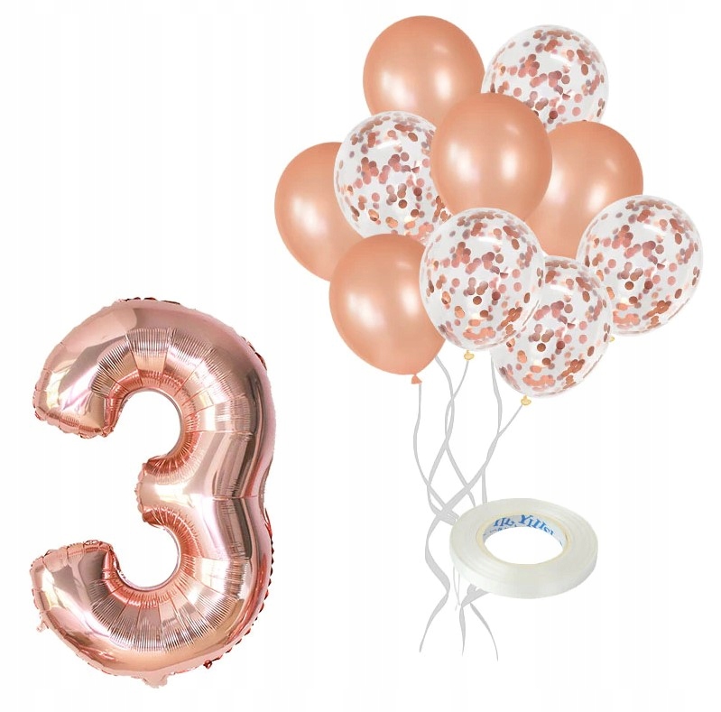 Zestaw balonów cyfra 3 rose gold konfetti urodziny