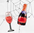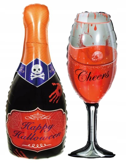 Balony foliowe na Halloween w kształcie kieliszka i butelki szampana. Czerwony kolor cieczy i spływające po rancie krople sugerują, że jest wypełniony krwią. Taki design sprawia, że balony idealnie nadają się na dekorację w Halloween.