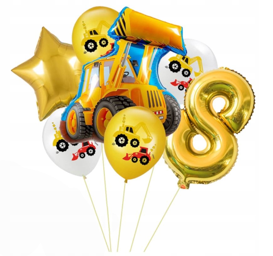 Zestaw balonów ósme 8 urodziny pojazdy koparka