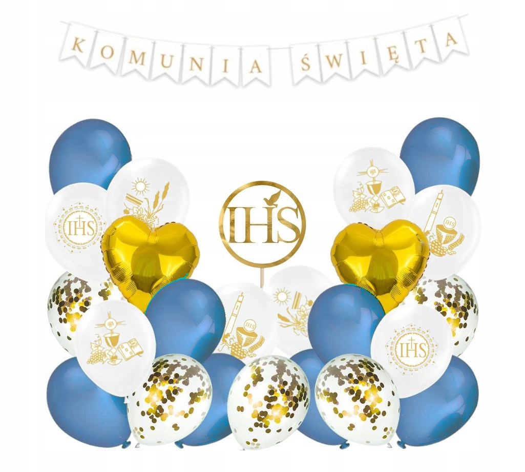 Zestaw balonów złoty niebieski komunia baner toper