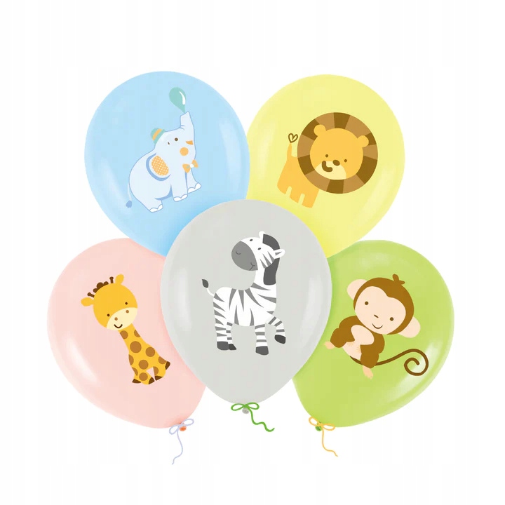 Pastelowe balony z wesołymi zwierzątkami: słoniem, lwem, żyrafą, zebrą i małpką. Idealny zestaw dla małych wielbicieli dzikich zwierząt lub bywalców ZOO.