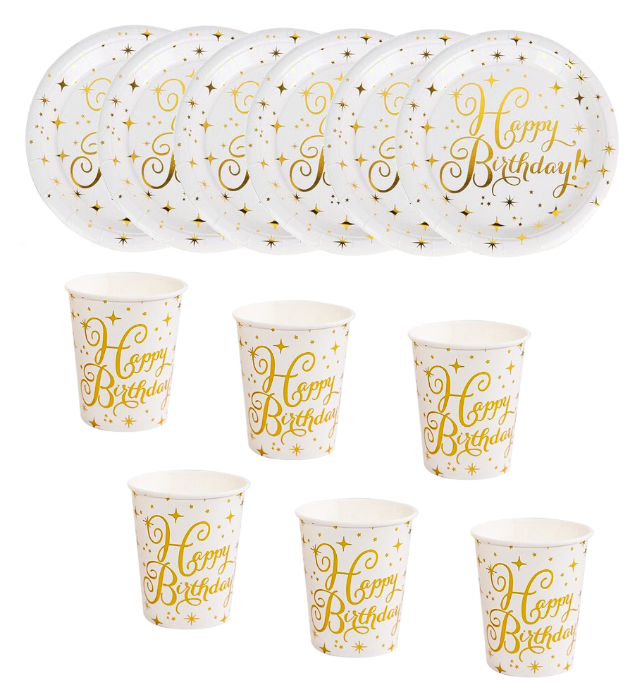 Zestaw kubki talerzyki białe złote w gwiazdki