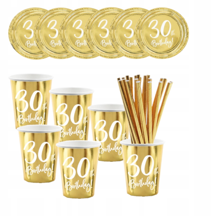Zestaw kubki talerzyki słomki złote 30 urodziny