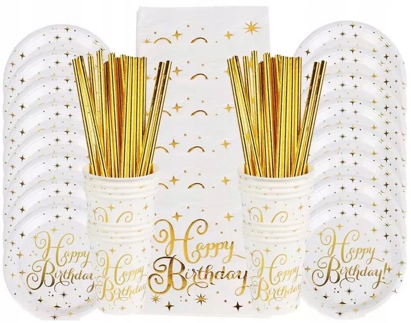 Zestaw kubki talerzyki złote urodziny na 8 osób