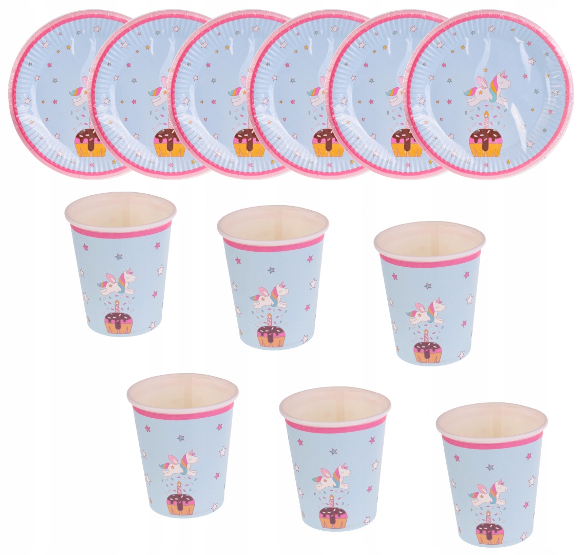 Zestaw urodzinowy kubki talerzyki jednorożec niebi